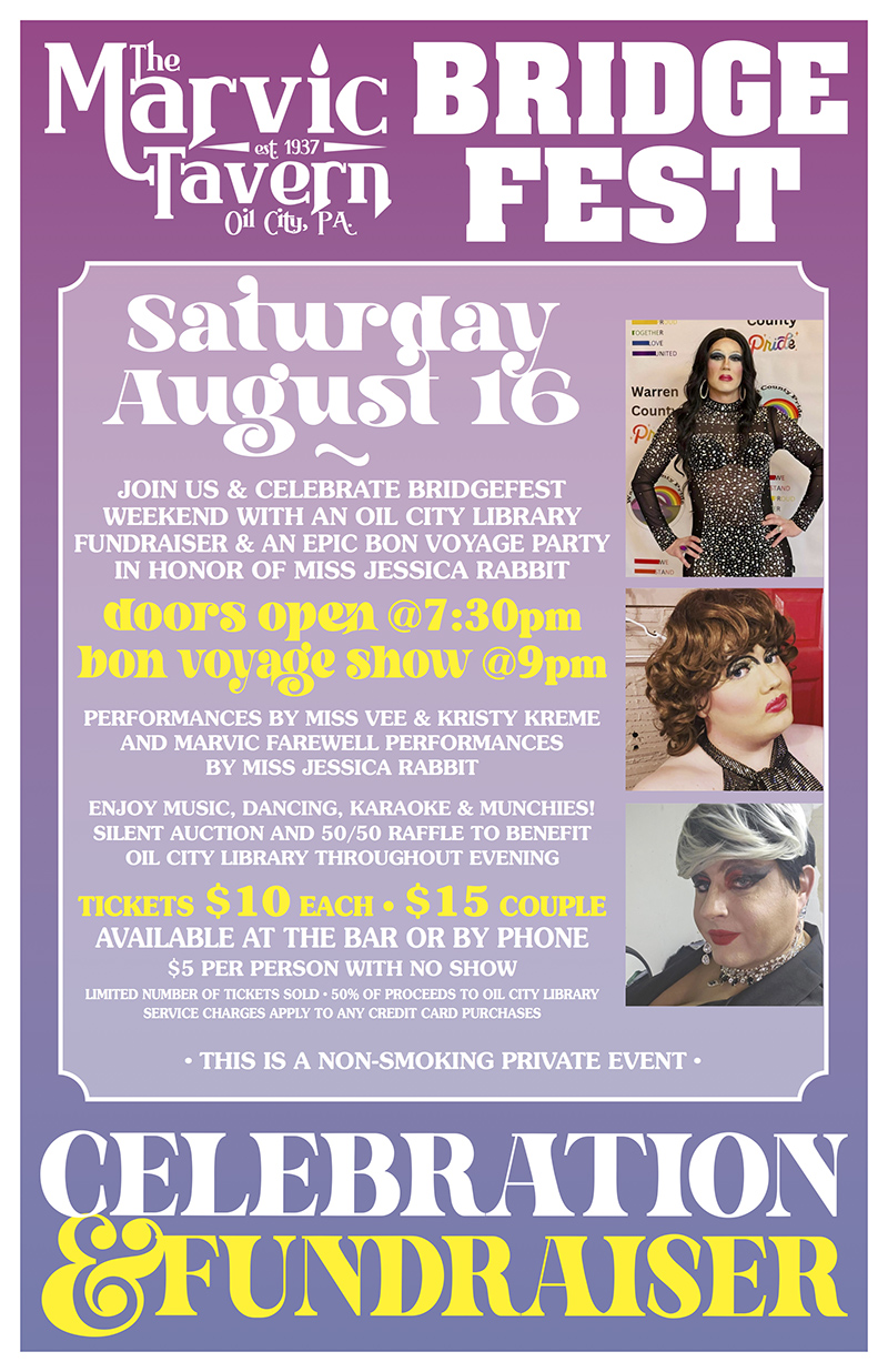 Bridgefest Celebration/ Bon Voyage Party and Fundraiser for Oil City Library. Festivities will include a silent auction, 50/50/raffle and donation jar to raise funds for the Oil City Library as well as entertainment from Miss V, Kristy Kreme, and Miss Jessica Rabbit’s final Oil City performances.